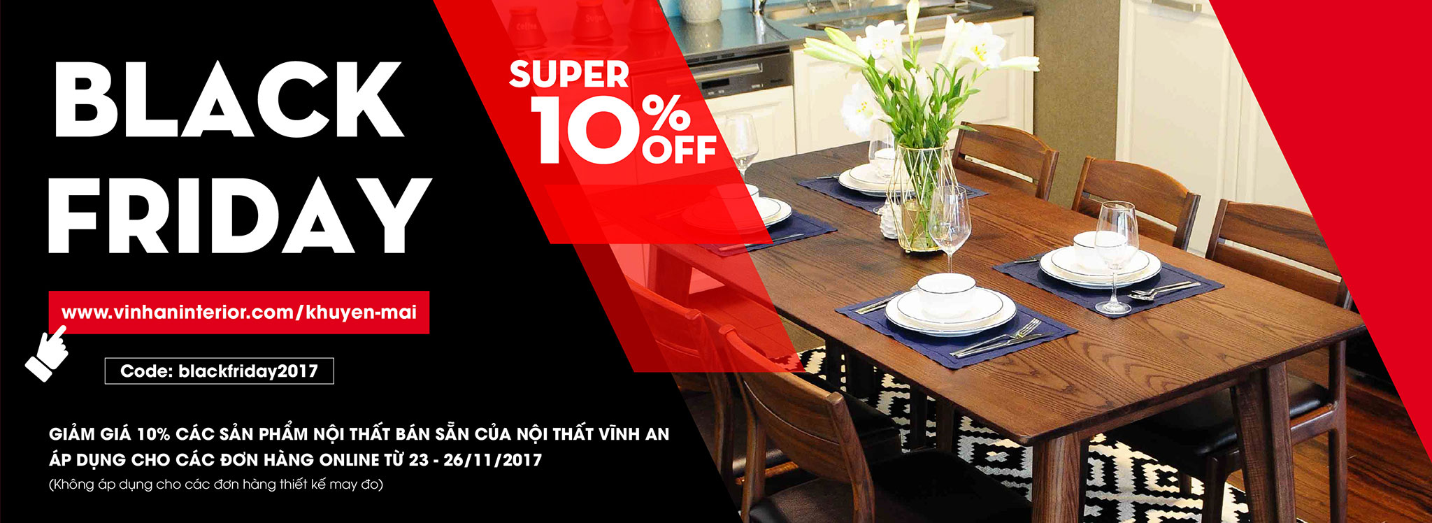 Chương trình giảm giá mùa Black Friday 2017 (từ ngày 23 – 26/11/2017), Nội thất Vĩnh An giảm giá trực tiếp 10% cho các sản phẩm nội thất có sẵn bao gồm: bộ bàn ăn, ghế, kệ tivi, bàn trang điểm, bàn trà khi khách hàng đặt hàng Online.